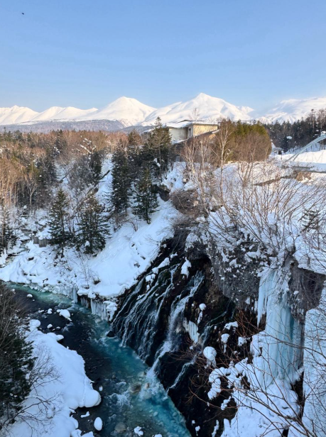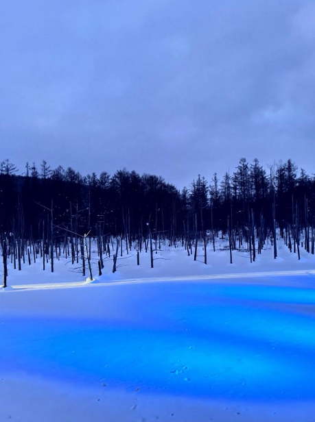 이번에는 흰수염 폭포로 이동했어요! 눈 덮인 산과 함께 흐르는 폭포의 모습이 정말 멋졌어요. 겨울에는 얼어붙어서 더욱 신비로운 분위기를 자아낸다고 하더라고요. 자연이 만들어낸 예술 작품 같았어요! 그리고 대망의 청의 호수! 사진으로만 보던 그 푸른빛을 직접 보니 너무 감동적이었어요. 날씨와 계절에 따라 색이 미묘하게 변한다고 하는데, 이날은 정말 맑고 투명한 파란색이었어요. 그냥 바라만 보고 있어도 힐링이 되는 느낌이었어요. 청의 호수는 인공적으로 만들어진 호수인데, 호수 바닥의 미네랄 성분 덕분에 이렇게 아름다운 색을 띤다고 해요. 겨울에는 호수가 얼어붙어 또 다른 분위기를 연출하는데, 설경과 함께 감상하는 청의 호수는 정말 신비로웠어요.