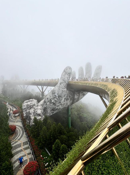 바나힐에서 가장 유명한 곳인 골든 브리지도 직접 가봤는데요, 사진으로 보던 것보다 훨씬 더 인상적이었어요. 거대한 손이 다리를 받치고 있는 독특한 구조인데, 실제로 보면 규모도 크고 분위기도 굉장히 신비로운 느낌이에요. 해발 높은 곳에 위치해 있어서 주변 풍경도 정말 아름다웠어요. 사진 찍기에도 정말 좋아서 여기서만 한참 시간을 보냈던 것 같아요. 사람이 많긴 했지만 그래도 충분히 만족스러운 사진을 남길 수 있었어요. 가능하면 조금 일찍 도착하는 일정이 사진 찍기에는 더 좋은 것 같아요.