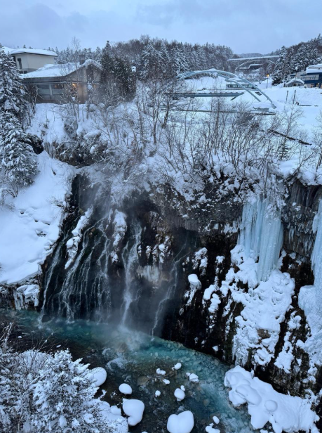 이번에는 흰수염 폭포로 이동했어요! 눈 덮인 산과 함께 흐르는 폭포의 모습이 정말 멋졌어요. 겨울에는 얼어붙어서 더욱 신비로운 분위기를 자아낸다고 하더라고요. 자연이 만들어낸 예술 작품 같았어요! 그리고 대망의 청의 호수! 사진으로만 보던 그 푸른빛을 직접 보니 너무 감동적이었어요. 날씨와 계절에 따라 색이 미묘하게 변한다고 하는데, 이날은 정말 맑고 투명한 파란색이었어요. 그냥 바라만 보고 있어도 힐링이 되는 느낌이었어요. 청의 호수는 인공적으로 만들어진 호수인데, 호수 바닥의 미네랄 성분 덕분에 이렇게 아름다운 색을 띤다고 해요. 겨울에는 호수가 얼어붙어 또 다른 분위기를 연출하는데, 설경과 함께 감상하는 청의 호수는 정말 신비로웠어요.