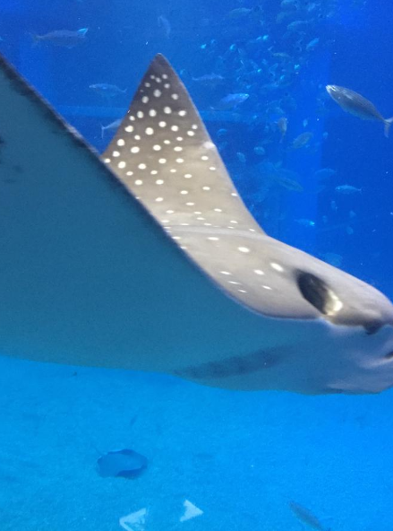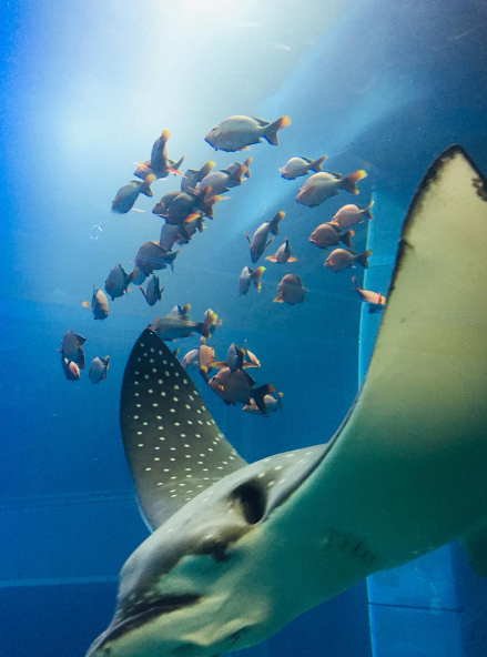 태평양 대수조는 가이유칸의 중심이 되는 수조로, 모든 관람객들이 가장 먼저 찾는 장소예요. 고래상어와 가오리가 유유히 헤엄치는 모습은 정말 장관이었어요. 고래상어는 워낙 거대한 생물이라 가까이서 보면 그 위용에 감탄하게 되는데, 이 수조가 워낙 커서 물고기들이 스트레스를 받지 않도록 설계되었다고 하더라고요. 이곳에서는 의자에 앉아 고래상어와 수조의 다른 해양 생물들이 헤엄치는 모습을 여유롭게 감상할 수 있어요. 주변이 조용하고 평화로운 분위기라, 여행 중 잠깐 쉬어가기도 좋았답니다.