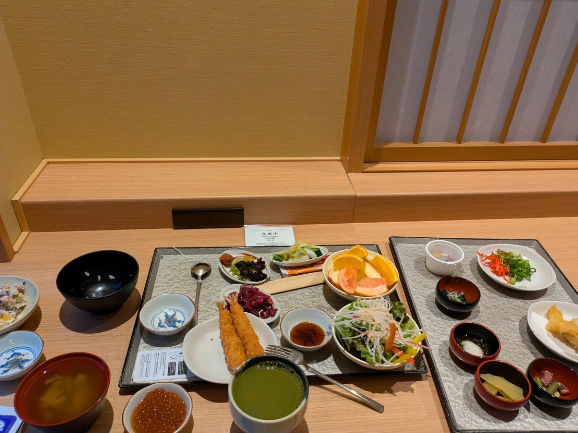 기대 이상의 일본 가정식 조식이 너무 만족스러웠어요! 단순한 뷔페식이 아니라 일본 가정식을 제대로 즐길 수 있는 구성이라 더욱 특별했답니다. 대표적인 메뉴로는 갓 지은 쌀밥, 미소국, 연어구이, 각종 절임 반찬, 온천 달걀, 교토 스타일 두부 요리 등이 포함되어 있었고, 따뜻한 우동과 튀김 요리도 함께 제공됐어요. 다양한 반찬 덕분에 입맛에 맞게 식사를 조절할 수 있었고, 신선한 샐러드와 과일, 디저트까지 갖춰져 있어서 아침부터 든든하게 먹을 수 있었어요.