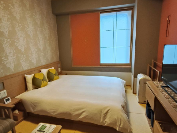 온야도 노노 호텔은 일본 전통 가옥인 료칸 스타일로 꾸며져 있어서 교토 감성을 제대로 느낄 수 있어요. 객실 내부는 우드 톤으로 따뜻한 분위기를 자아내고, 바닥이 다다미로 되어 있어서 신발을 벗고 다녀야 하는 구조예요. 덕분에 집처럼 편안한 느낌이 들었답니다! 침대는 세미 더블 사이즈로 다소 작은 편이지만, 탄탄한 매트리스 덕분에 숙면을 취하기에 충분했어요. 기본적인 어메니티는 물론이고, 일본 호텔답게 잠옷(유카타)까지 준비되어 있어서 호텔 안에서도 일본 감성을 그대로 즐길 수 있어요.
