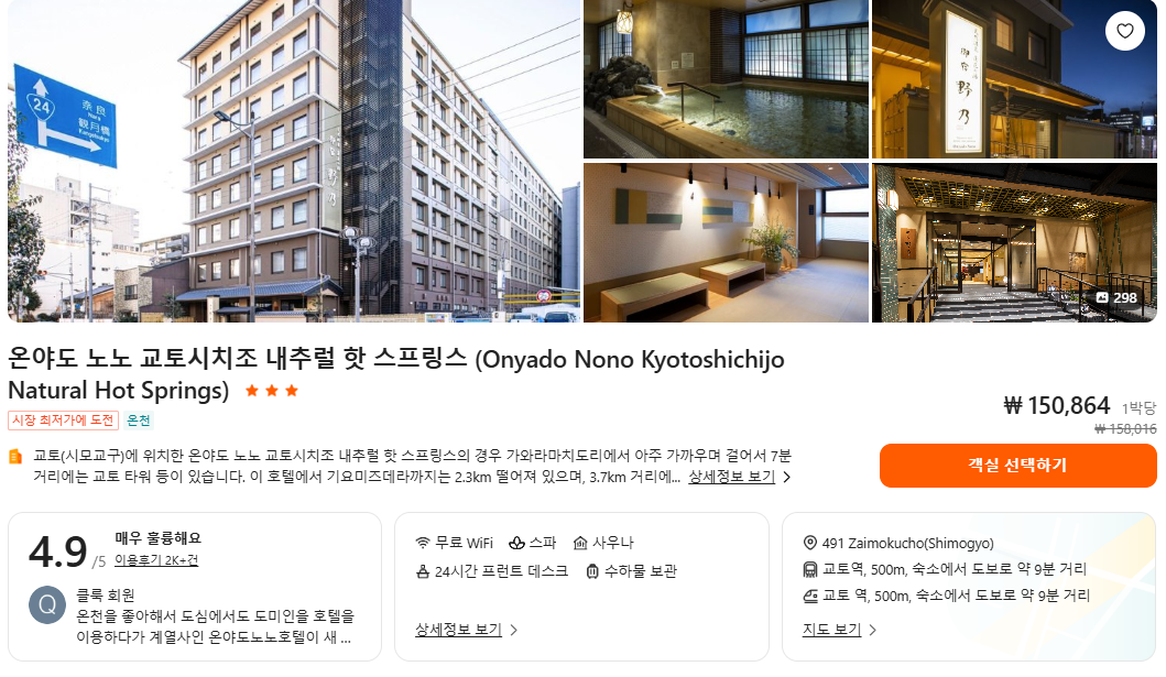 일본 전통 료칸 스타일의 감성적인 호텔, 천연 온천 대욕장 완비로 여행 피로 해소 가능, 다다미 객실에서 일본 분위기를 느낄 수 있음, 다양한 메뉴가 제공되는 일본식 조식, 교토 주요 관광지와 가까운 최적의 위치, 깔끔한 시설과 친절한 직원 서비스 교토에서 전통적인 분위기와 온천을 함께 즐기고 싶다면, 온야도 노노 교토 시치조 내추럴 핫 스프링 호텔은 정말 훌륭한 선택이에요! 가격 대비 시설과 서비스가 뛰어나고, 일본 특유의 정갈한 분위기를 경험할 수 있어서 만족도가 높은 숙소였어요. 다음 교토 여행에서도 다시 찾고 싶은 호텔이었답니다!