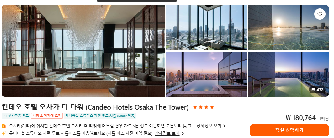 칸데오 호텔 오사카 더 타워 글은 클룩을 통해 예약 시 실적에 따라 소정의 수수료를 지급받습니다. 클룩을 통해 구매하지 않으셔도 좋아요! 작성한 글이 조금이나마 도움이 되셨으면 좋겠습니다. 제가 다녀온 여행에서 가장 만족한 숙소, 칸데오 호텔 오사카 더 타워에 대한 후기입니다! 사실 오사카는 이미 여러 번 다녀와서 특별히 새로운 숙소를 찾고 있었는데, 이번에 딱 제 눈에 들어온 이곳! 정말 기대 이상이었답니다.